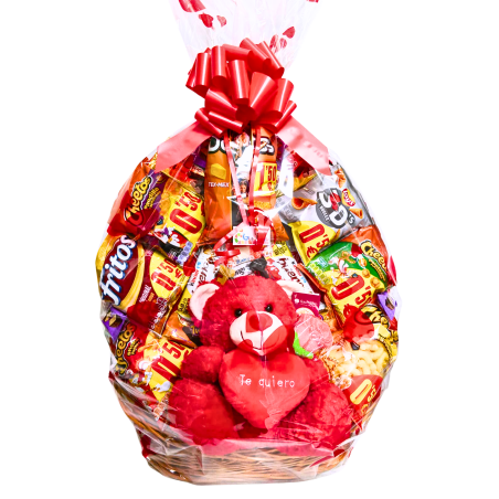 Presentación cuidada en cesta decorativa con envoltorio transparente y lazo festivo.
