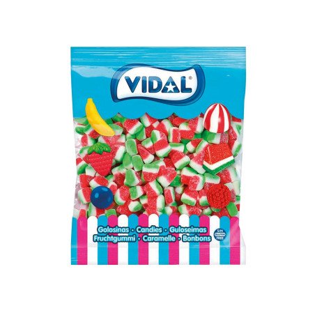 Disfruta del sabor refrescante y divertido de las Vidal Mini Tajadas Sandía 1 kg, suaves gominolas con forma de pequeñas tajadas de sandía y un toque ligeramente ácido que hace que cada bocado sea irresistible. Ideales para fiestas, cumpleaños, mesas dulces o simplemente para compartir en cualquier momento, estas gominolas mini son perfectas para picar y disfrutar al instante.